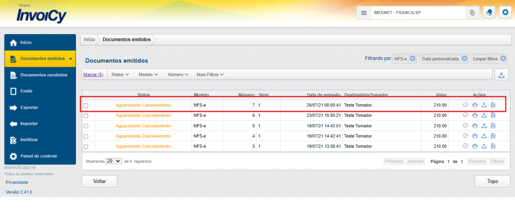 A partir da nova versão do InvoiCy, os municípios de Franca-SP e Jacareí-SP poderão enviar o cancelamento de uma NFS-e e o mesmo ficará como “Aguardando Cancelamento”.