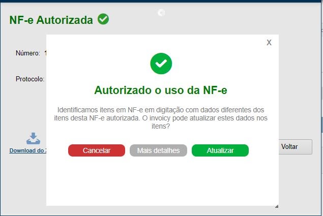 Observação: caso o usuário clique em cancelar, os dados estão atualizados somente no item da nota autorizada e no cadastro do produto na tela de “Itens Comercializados”, porém se escolher a opção “Atualizar”, os dados serão alterados nos mesmos itens que estão incluídos nas NF-e em digitação.
