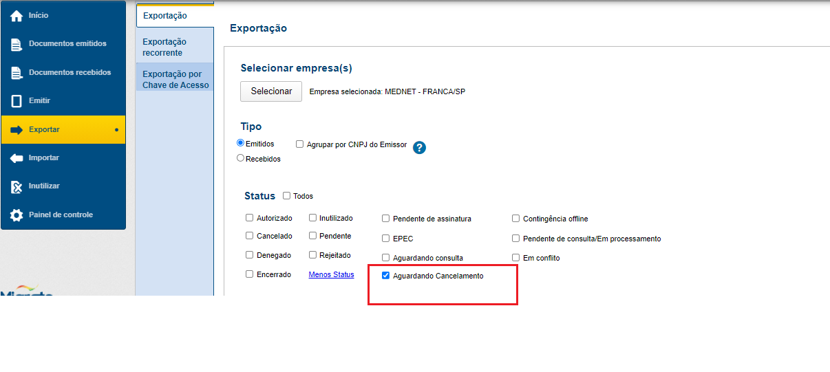 A exportação de documentos via tela também passa a considerar o novo status “Aguardando Cancelamento” nos filtros para busca de documentos.