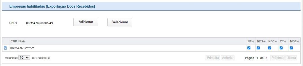 Somente CNPJ’s listados nesta tela terão permissão para exportação de documentos recebidos para o Conector em questão.