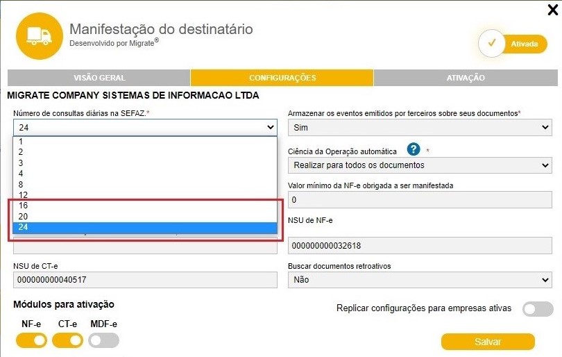 Foi aumentado o número de consultas diárias máxima de 12 para até 24 consultas no campo “Número de consultas diárias na SEFAZ” nas configurações da extensão de Manifestação do destinatário.
