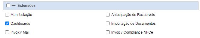 E ao editar o cadastro do usuário específico o parceiro deverá desmarcar nas configurações de permissão a opção ‘Dashboards’ do grupo ‘Extensões’, como demonstra a imagem abaixo.