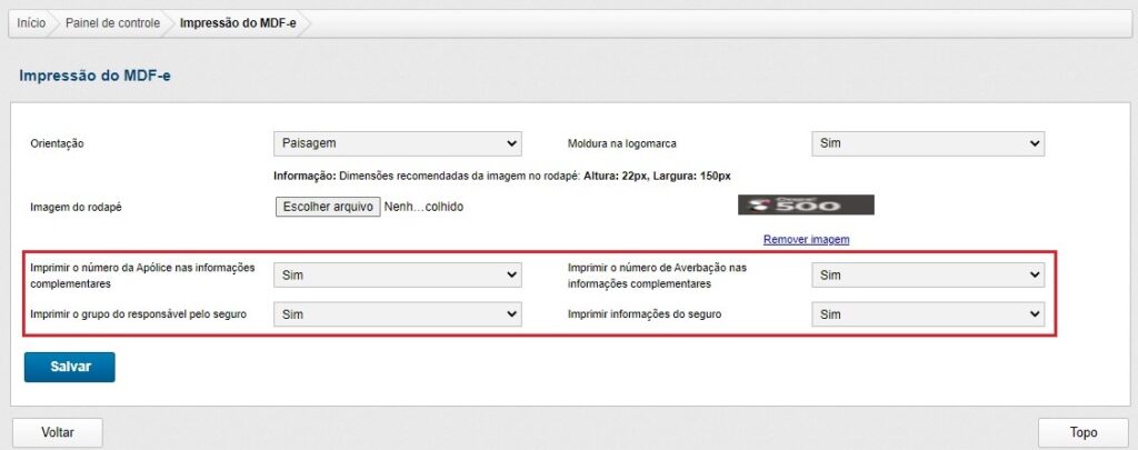 A partir dessa versão, as configurações de Impressão do MDF-e contam com quatro novos parâmetros, são eles: ‘Imprimir o número da Apólice nas informações complementares’, ‘Imprimir o grupo do responsável pelo seguro’, ‘Imprimir o número de Averbação nas informações complementares’ e ‘Imprimir informações do seguro’.