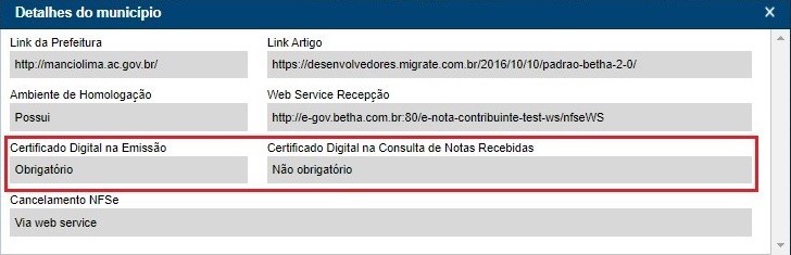 Além disso, foi adicionado um novo campo chamado “Certificado Digital na Consulta de Notas Recebidas”, que irá informar se é Obrigatório ou Não obrigatório o certificado digital para a utilização deste serviço. Será apresentada essa informação apenas para os Municípios que possuírem Web Service, Web Service (1) ou Web Service (2) no campo N. Recebidas.