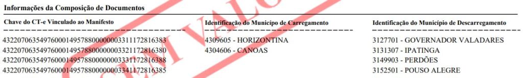 Ao habilitar o parâmetro “Imprimir município de carregamento e descarregamento”, as informações dos municípios de carga e descarga serão impressas em seus respectivos campos. Abaixo, pode-se observar um exemplo de impressão com os novos campos parametrizados como “Sim”.