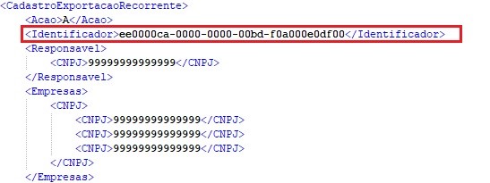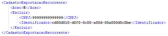 Para realizar a exclusão da exportação recorrente, é necessário enviar a estrutura de exclusão, conforme demonstra a próxima imagem, informando a ação, CNPJ da empresa e o código “Identificador”.