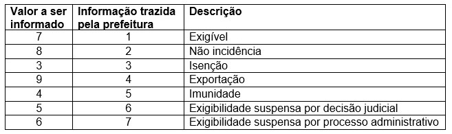 O campo de natureza da operação deverá seguir o padrão ABRASF: