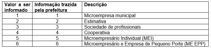 Conforme o padrão ABRASF seguem os seguintes valores para o campo de Regime Especial de Tributação:
