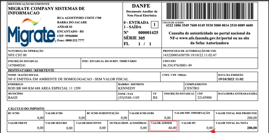 Configurando este parâmetro como ‘Sim’, será somado o valor AFRMM de cada item da NF-e, e impresso no DANFE quando o parâmetro ‘Imprimir valor total da AFRMM’ também estiver configurado como ‘Sim’. Veja na imagem abaixo um DANFE apresentando a soma dos valores AFRMM de uma NF-e.