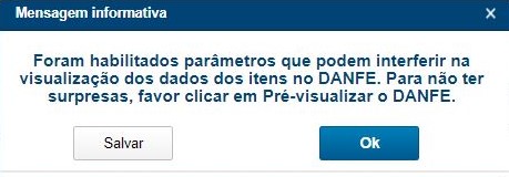 A inclusão desta mensagem informativa, sugerindo a pré-visualização da impressão antes de salvar, irá evitar que ocorra algum tipo de problema nos dados dos produtos e serviços na impressão do DANFE. O popup abaixo será aberto quando clicar em Salvar.