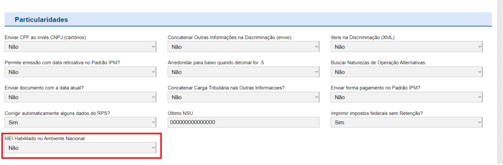 A configuração também está disponível em Painel de Controle > Configurações para emissão de NFS-e > Particularidades “MEI Habilitado no Ambiente Nacional”.