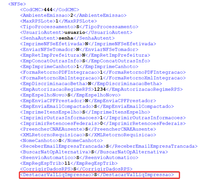 Essa configuração também poderá ser realizada via API, no momento do cadastro da empresa ou atualizando os dados, no caso de empresas já cadastradas. Para isso, é necessário informar o campo “DestacarValLiqImpressao”, dentro dos Parâmetros do Módulo NFS-e, conforme exemplo a seguir: