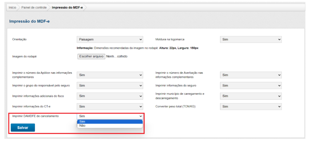 – Impressão de DAMDFE de cancelamento para MDF-e – Através das configurações de Impressão do MDF-e, o InvoiCy permitirá que o usuário realize a impressão de DAMDFE canceladas, definida através de um combo com as opções de SIM ou NÃO.