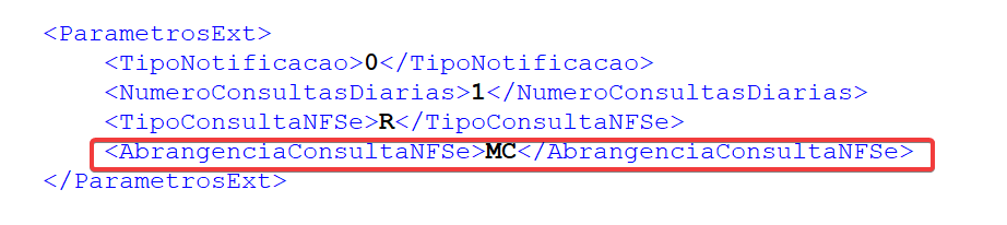 Para isso, basta informar a tag , no grupo . Os valores aceitos são: MC – para consultar apenas nos municípios cadastrados e TM – para consultar em todos os municípios.