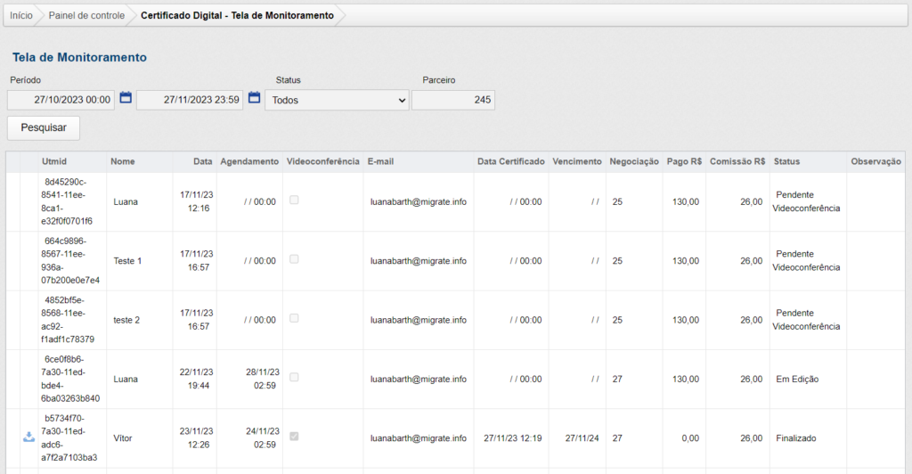 Já a Tela de Monitoramento como o próprio nome já diz, é a tela para o monitoramento do parceiro sobre as vendas dos certificados, essa tela apresenta algumas informações básicas sobre a compra do certificado, por exemplo: