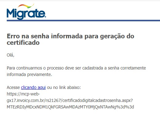 O certificado só será gerado se a senha estiver correta, caso informe uma senha que não é válida, será enviado um email notificando e solicitando para que o processo seja refeito, conforme imagem abaixo: