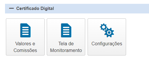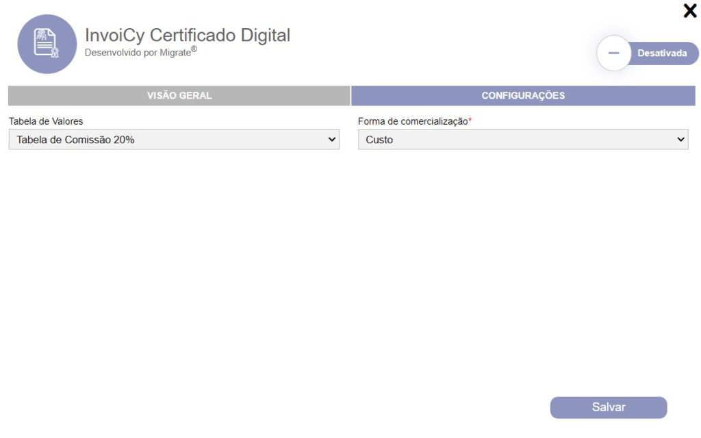 Após a extensão ativa, se o parceiro desejar realizar alguma alteração nos dados das configurações da extensão, essas poderão ser alteradas acessando a opção de “Configurações” disponibilizada para os parceiros que contratarem a extensão, em Painel de Controle no Invoicy foi criada uma nova opção chamada “Certificado Digital”, contendo três telas para monitoramento da extensão e vendas dos certificados: