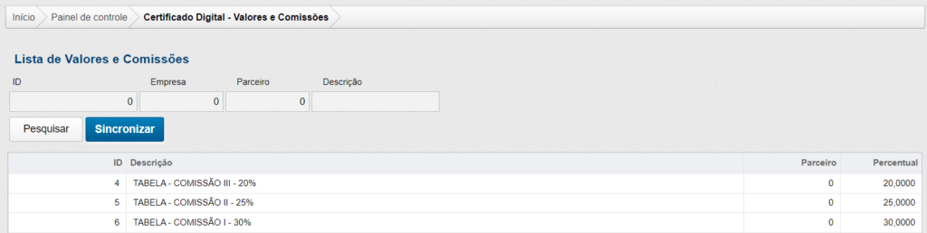 A opção de Valores e Comissão apresenta a Lista das tabelas de valores e comissões cadastradas pelo parceiro, contendo a descrição da tabela, o código do parceiro e o percentual de comissão referente a cada tabela criada.