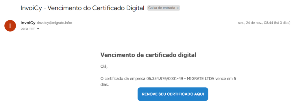 – E-mail – Aviso de Vencimento pelo InvoiCy: Através de e-mail personalizado que é enviado informando o vencimento do certificado para os clientes finais.