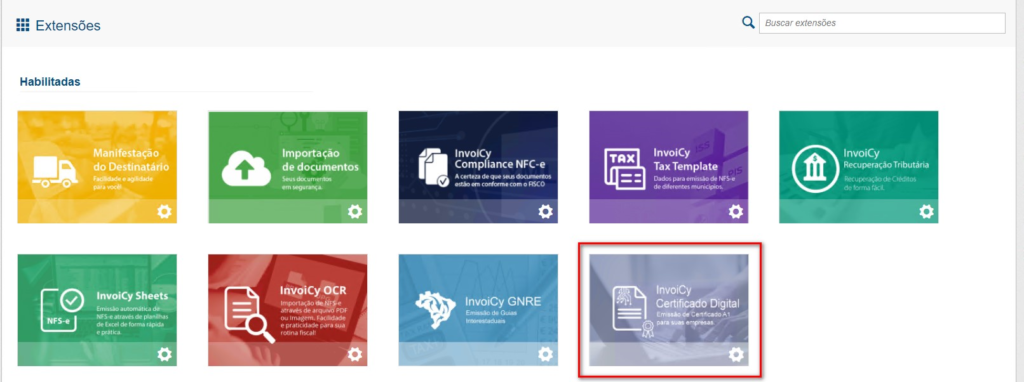O acesso para ativar a extensão pode ser realizado por meio dos atalhos disponibilizados na janela Extensões, localizado na parte superior direita da aplicação, como demonstrado no artigo Extensões do InvoiCy. Lembrando que para essa extensão a ativação não irá gerar custo para o parceiro.