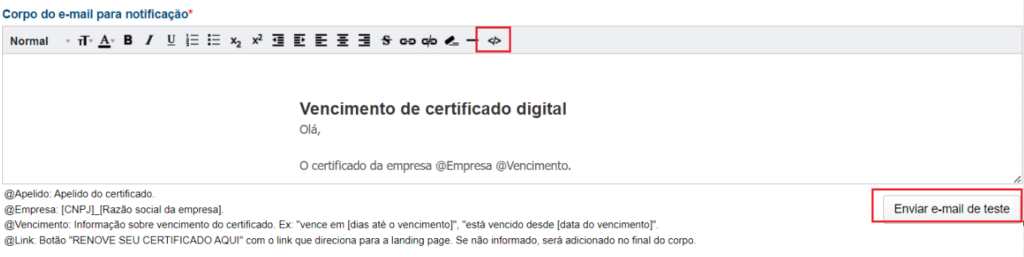 Corpo do email para notificação: O parceiro pode configurar uma padrão de mensagem para o email de notificação do certificado que será enviado para o cliente que consumir o produto. Além dos textos serem editáveis, há algumas ações já pré determinadas que ele pode utilizar, como por exemplo: