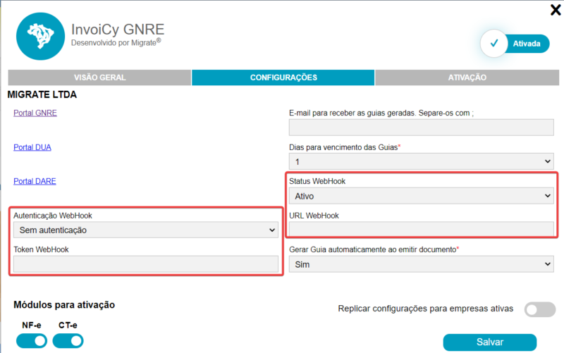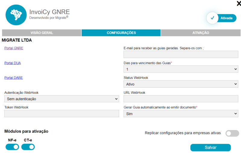 Seguindo o padrão das demais extensões, há nessa tela a aba de “Configurações” onde podem ser definidos os parâmetros para a extensão, como e-mails para receber as guias geradas, o prazo de vencimento para as guias, configurações de webhook e também uma opção de configurar para que o InvoiCy gere automaticamente as guias quando for emitido documento NF-e ou CT-e que esteja dentro da obrigatoriedade da GNRE.