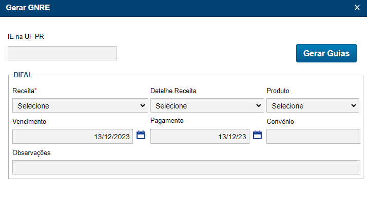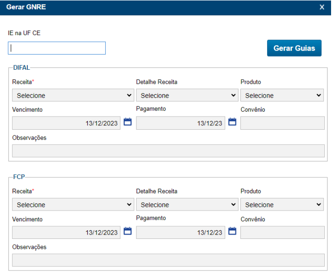 Na hipótese de um documento emitido para uma determinada UF possuir os campos dos tributos alimentados no documento, e caso a UF não possua receitas para emissão da guia, será realizada essa validação no momento de selecionar o documento, e com isso não irá aparecer os campos para preenchimento de informações do tributo correspondente.