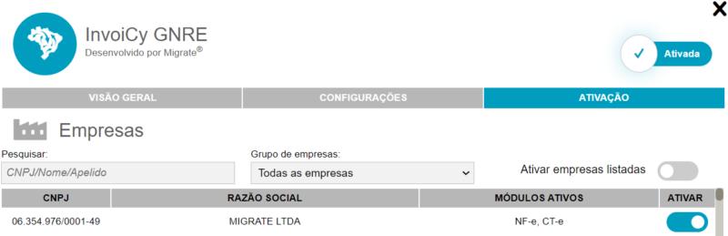 Na aba “Ativação” é possível realizar a ativação da extensão para uma ou mais empresas que o usuário tenha acesso, por meio da opção “Ativar”.