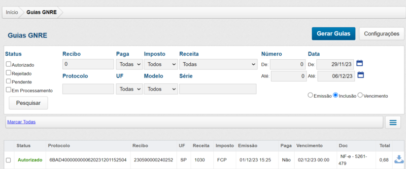 Essa tela irá apresentar as guias que já foram geradas, permitindo realizar vários filtros para localizar uma ou mais guias específicas.