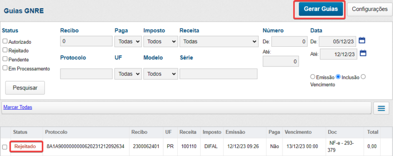 Na tela “Selecionar documentos para gerar Guia” é preciso marcar o campo “Exibir Documentos Concluídos”, com isso, será apresentado na lista o documento para o qual foi gerada uma guia que foi rejeitada, permitindo assim a emissão de uma nova guia.