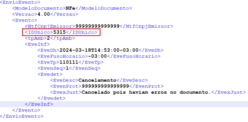 Já no envio do cancelamento, se o cliente optar por inserir além da tag IDUnico as tags de série e número do documento e por ventura informar o número de um documento que não corresponda ao mesmo documento do IDUnico, a numeração e série serão ignoradas pois sempre o que prevalece é o número do IDUnico.
