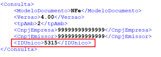 Para realizar a consulta do documento é preciso preencher apenas a tag <IDUnico>, com o mesmo valor utilizado na emissão da NF-e. Conforme exemplo: