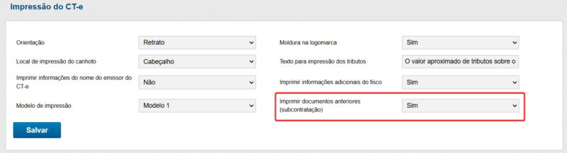 Para ativar a exibição dos Documentos Anteriores no DACTE, basta selecionar a opção “Sim” no campo destacado e salvar as configurações.