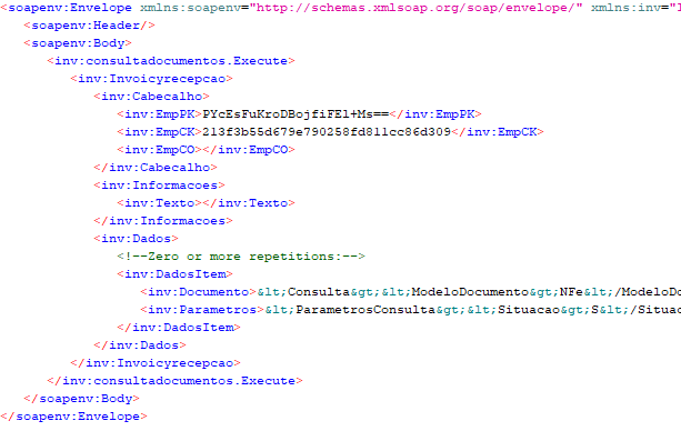 Documento: Conteúdo do XML com os parâmetros da consulta a ser enviada para o InvoiCy.